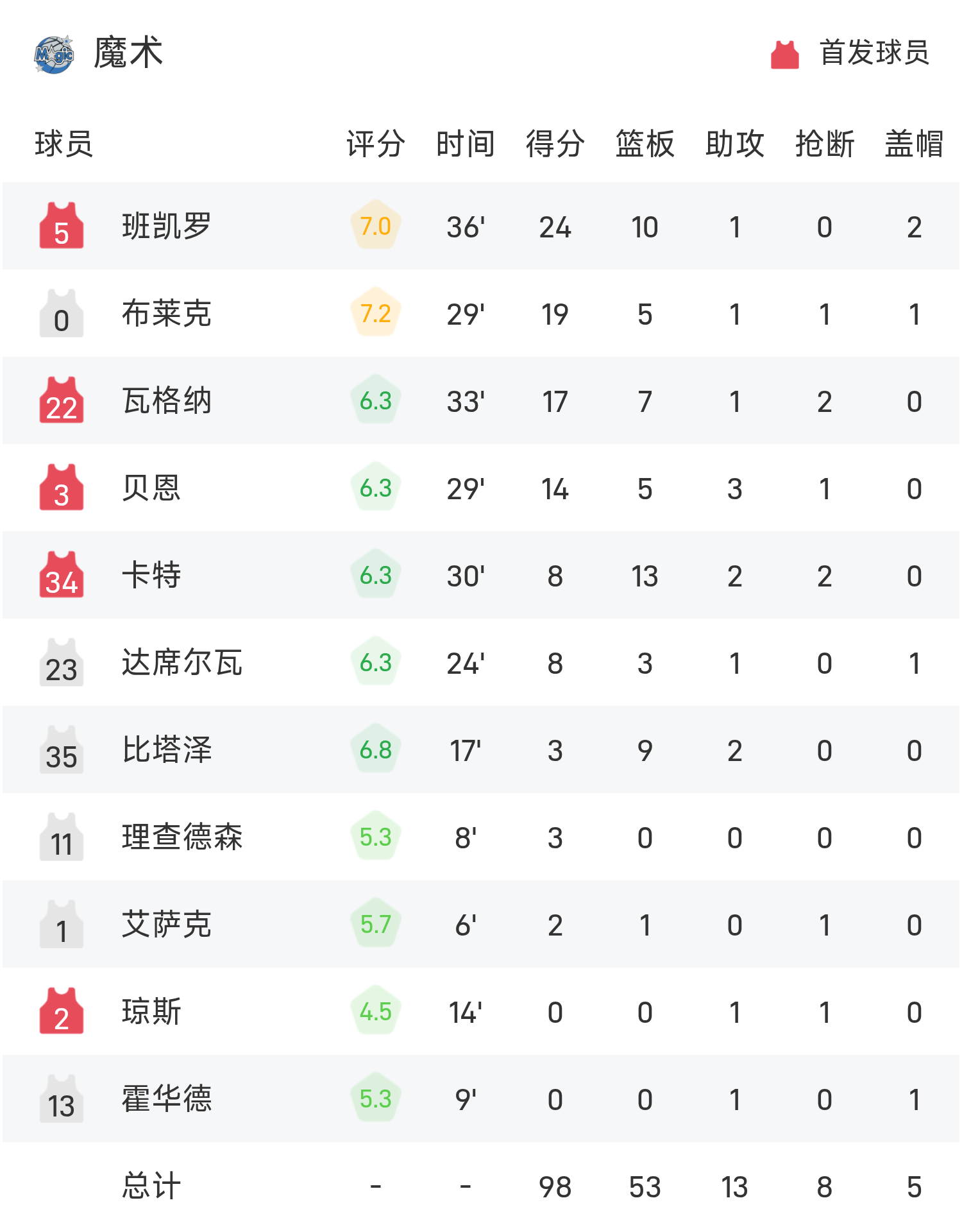 吉迪得到21分8板3助率队取胜,班凯罗空砍全场最高的24分10板1助。