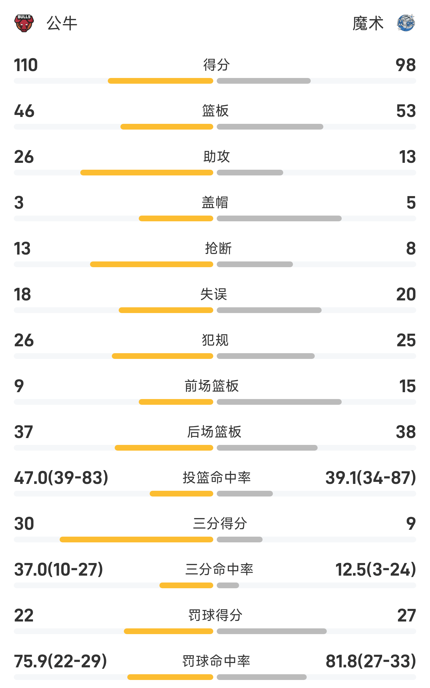 双方全场战罢,魔术98-110不敌公牛。