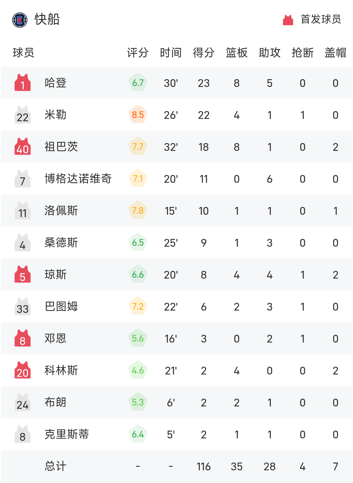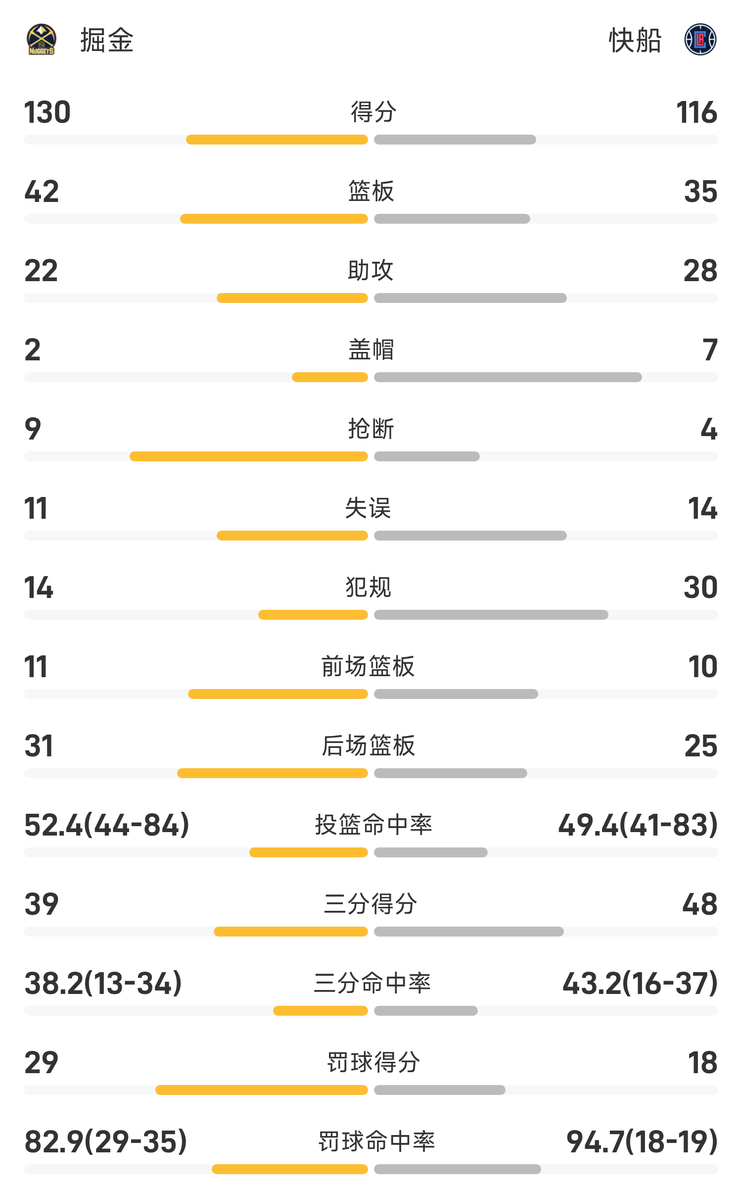 双方全场战罢,快船116-130不敌掘金。