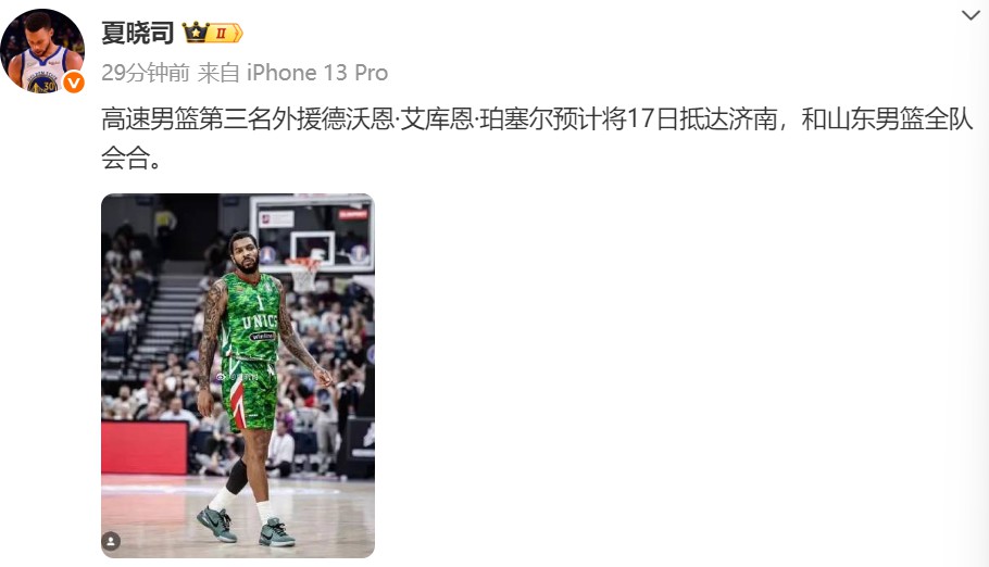 社媒原文:“山东男篮第三名外援德沃恩·艾库恩·珀塞尔预计17日抵达济南,和山东男篮全队会合。 ”