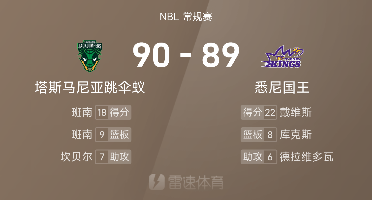 6686体育app10月26日讯 25/26赛季NBL 常规赛,悉尼国王对阵塔斯马尼亚跳伞蚁。双方全场战罢,悉尼国王89-90不敌塔斯马尼亚跳伞蚁。班南得到18分9板2助率队取胜,戴维斯空砍全场最高的22分6板5助。