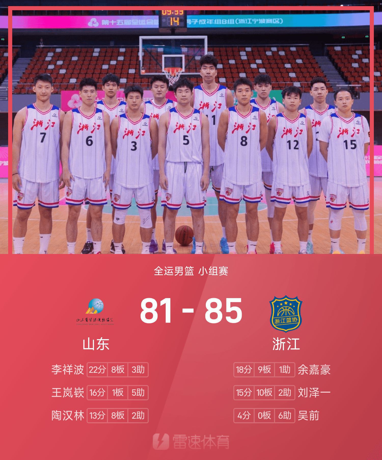 6686体育app11月06日讯 全运男篮分组赛,浙江对阵山东。双方全场战罢,浙江85-81战胜山东。余嘉豪得到18分9板1助率队取胜,李祥波空砍全场最高的22分8板3助。