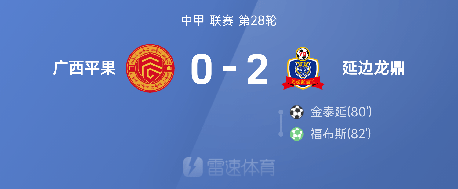6686体育app10月26日讯 25赛季中甲联赛事第28轮,延边龙鼎2-0战胜广西平果。全场竞赛,福布斯、金泰延破门建功。
