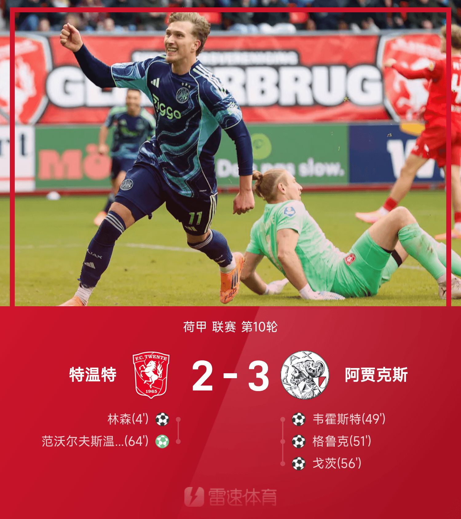 6686体育app10月26日讯 25/26赛季荷甲联赛事第10轮,阿贾克斯3-2战胜特温特。全场竞赛,林茨开场闪击建功,下半开场韦霍斯特、格鲁克、戈茨7分钟连进3球完成逆转,范沃尔夫斯温克尔十二码破门难救主。