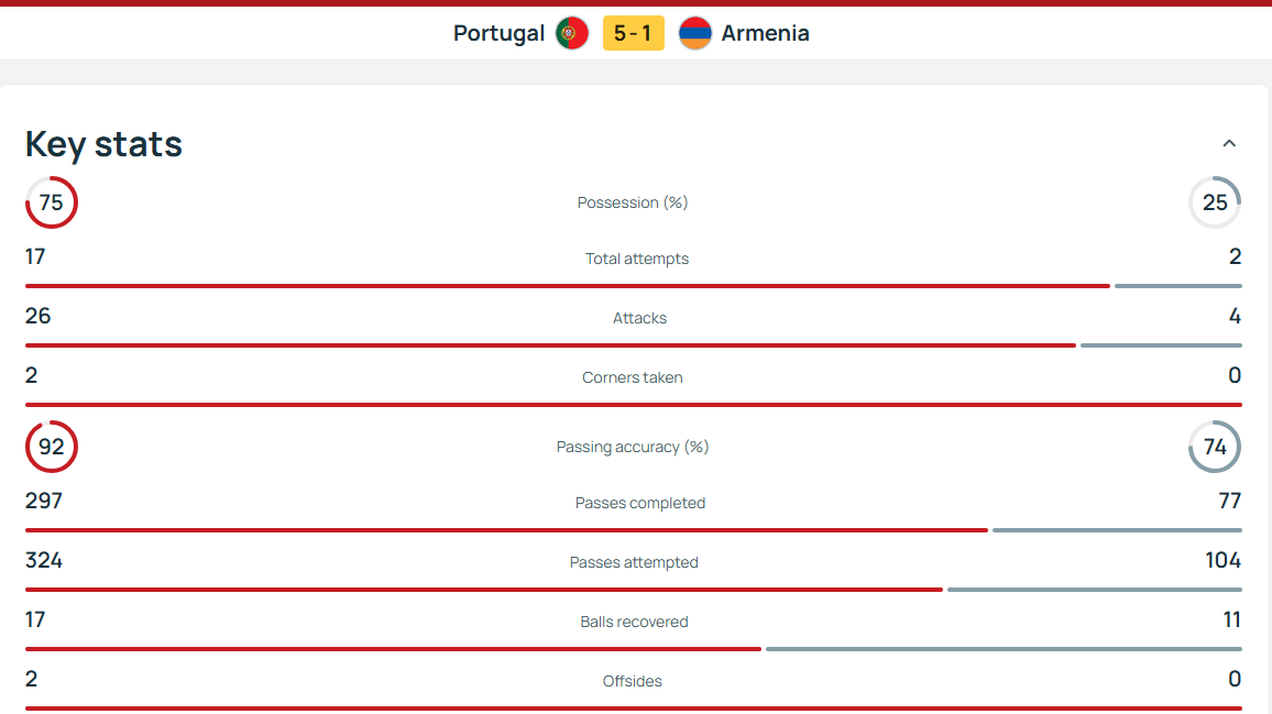 从半场数据来看,葡萄牙盘球率接近八成,狂射17脚。
