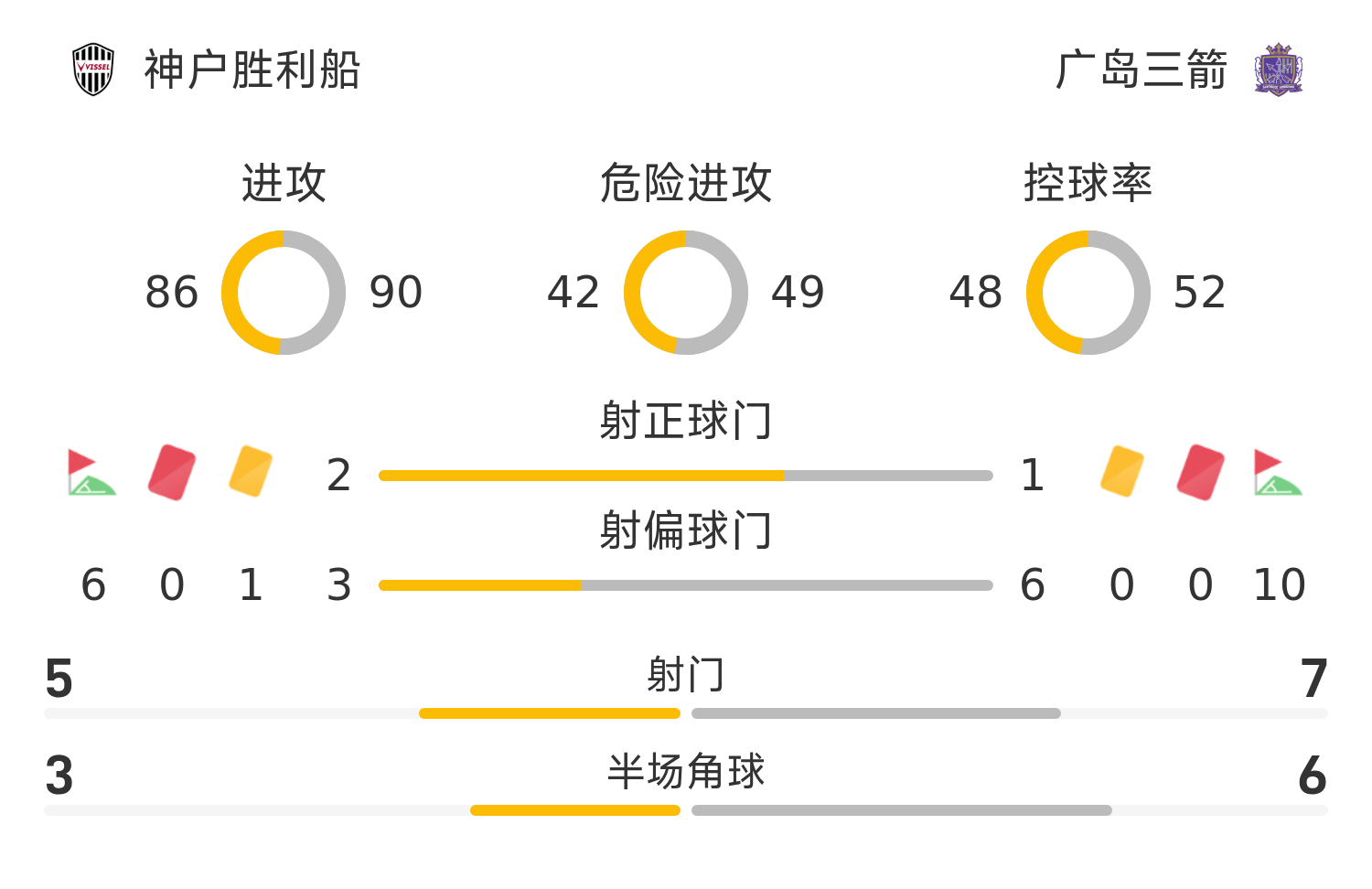 广岛三箭首发阵容:1-大迫敬介、33-盐谷司、19-佐佐木翔、15-中野就斗、39-中村草太、6-川边骏(73’41-前田直辉)、24-东俊希(70’13-新井直人)、14-田中聪、17-木下康介(73’98-热尔曼)、9-杰梅恩·良、51-加藤陆次树(46’30-阿尔斯兰)