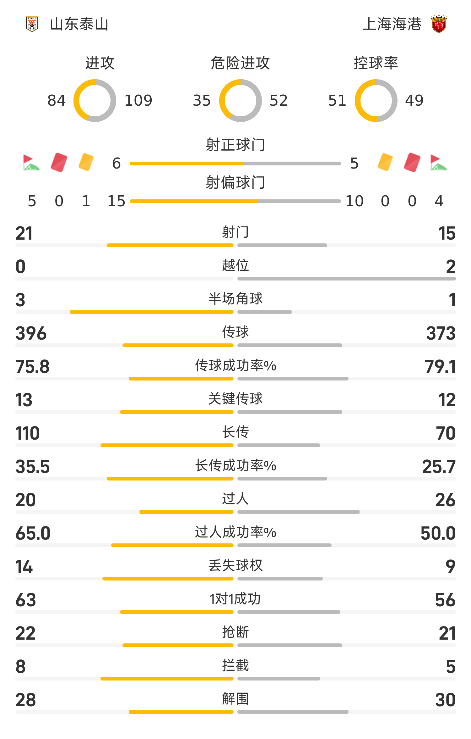 山东泰山首发阵容:14-王大雷、5-郑铮(46’22-李源一)、33-高准翼、11-刘洋(84’17-吴兴涵)、55-彭啸、35-黄政宇、8-马德鲁加、10-卡扎伊什维利、9-克雷桑、19-泽卡、38-李小恒(46’23-谢文能)
