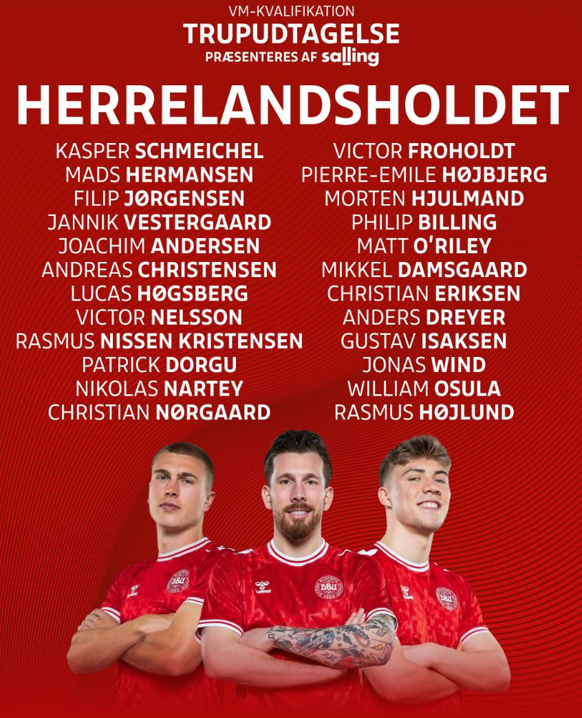 6686体育app11月6日讯 11月份的国际竞赛日,丹麦将迎来两场世杯赛欧洲区资格赛,分别对阵白俄罗斯和苏格兰。今天丹麦队官方公布了新一期的国家队大名单,其中霍伊伦领衔锋线,中场埃里克森入选。