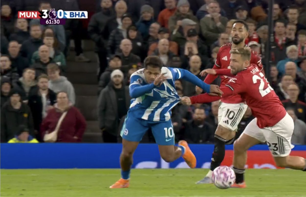 6686体育app10月26日讯 英超联赛事第9轮,曼联主队场对阵布莱顿的下半场竞赛第61分钟,卢克·肖守卫中拉拽布莱顿攻击手吕特致其倒地,随后曼联反击取得进球,3-0领跑位。主裁判判安东尼·泰勒拒绝吹罚卢克·肖此前的守卫违例。