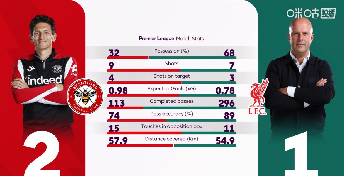 布伦特福德vs利物浦半场数据对比: