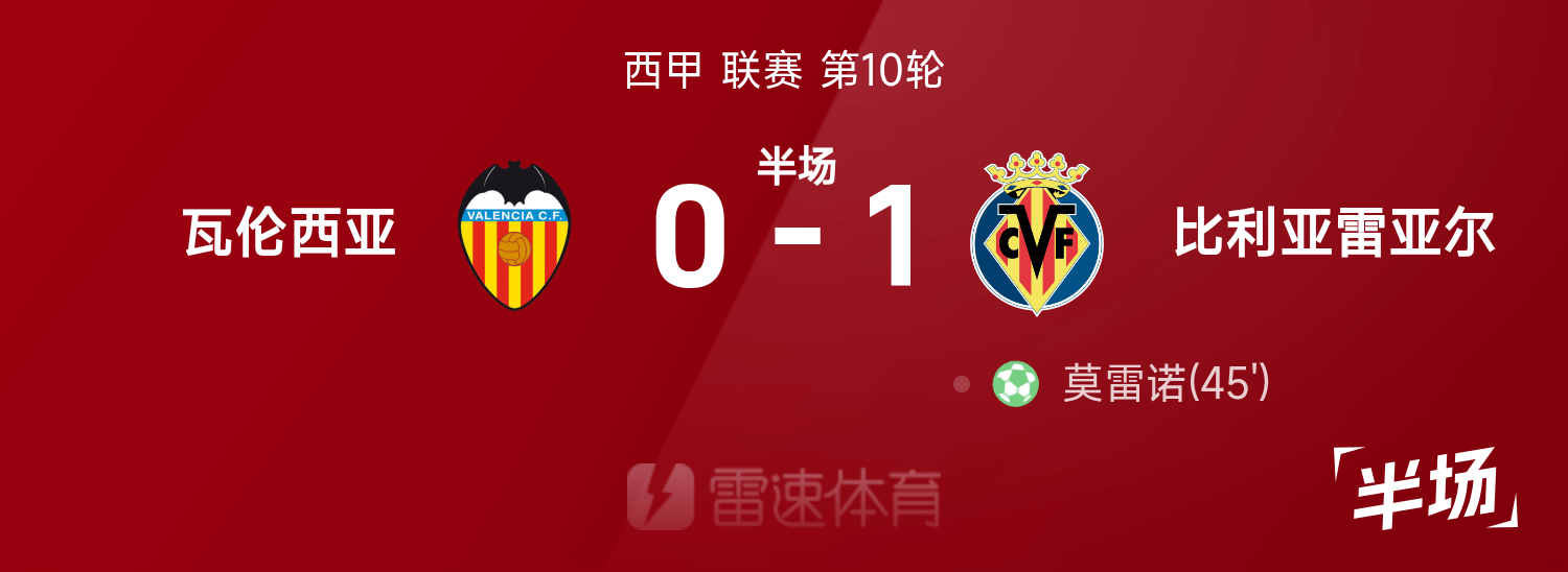 西甲半场:莫雷诺造点+主罚破门,黄潜1-0领跑位瓦伦西亚