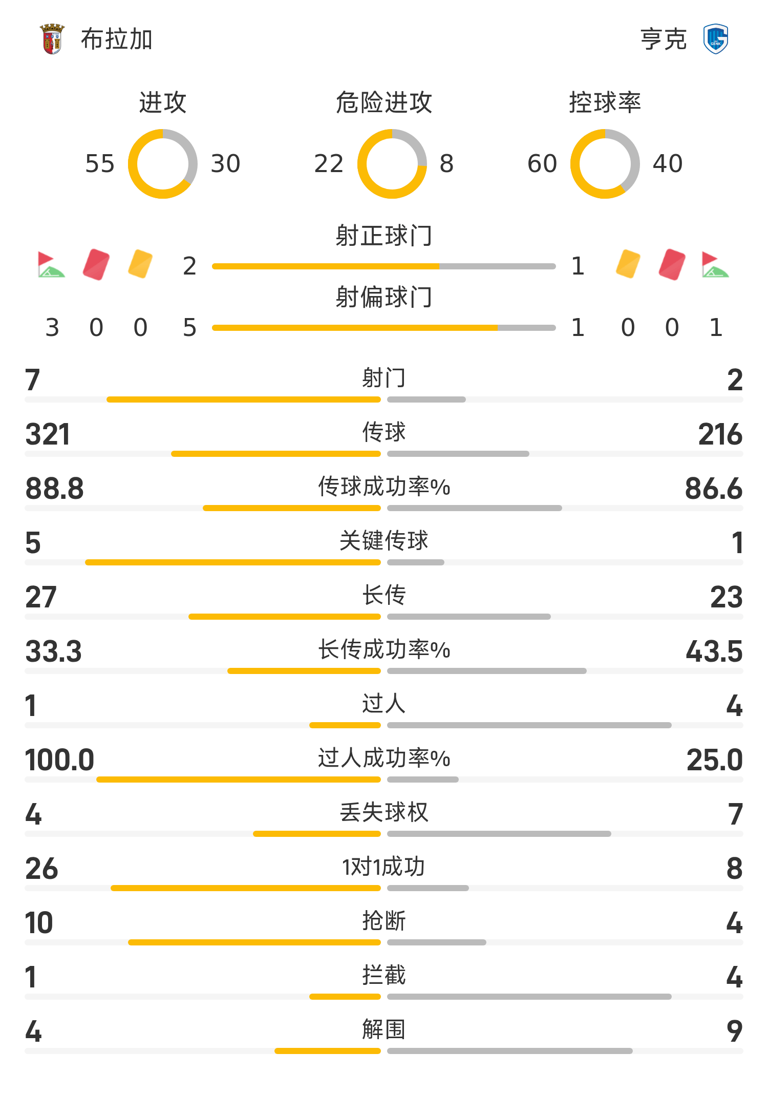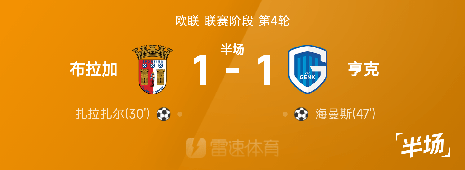 6686体育app11月07日讯 25/26赛季欧联联赛事阶段第4轮,布拉加迎战亨克。半场战罢,双方赛果分暂为布拉加1-1亨克,扎拉扎尔、海曼斯破门建功。