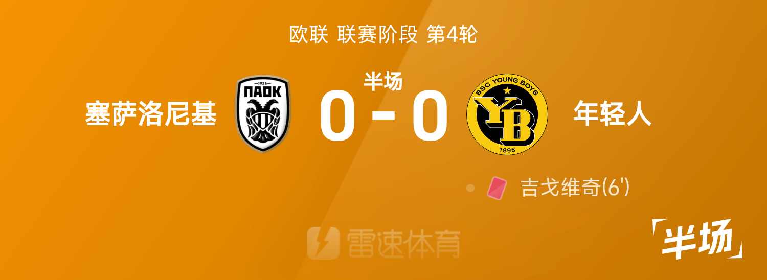 6686体育app11月07日讯 25/26赛季欧联联赛事阶段第4轮,塞萨洛尼基迎战年少人。半场战罢,双方赛果分暂为塞萨洛尼基0-0年少人,吉戈维奇染红。